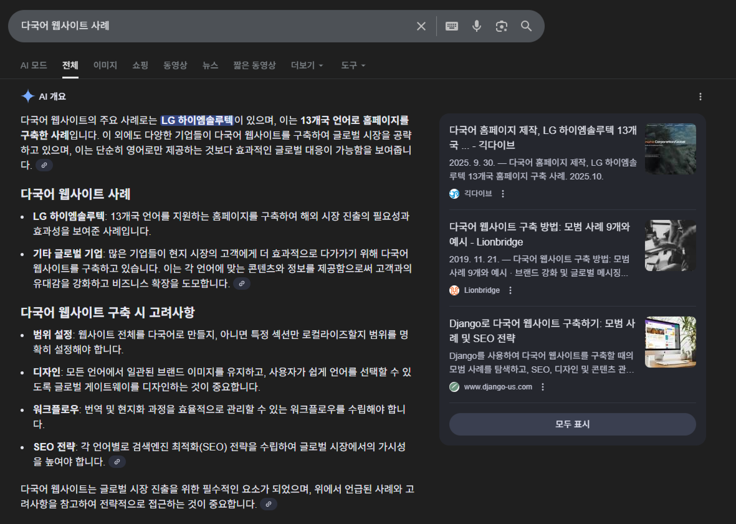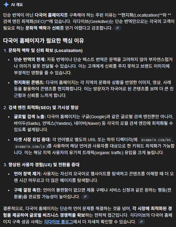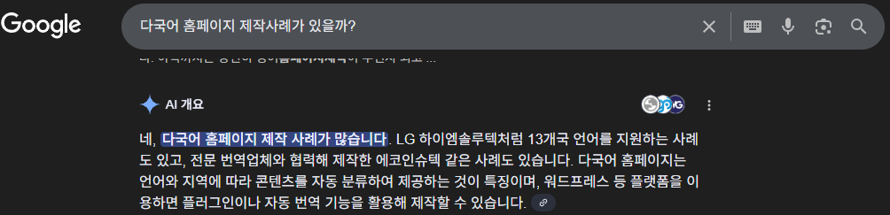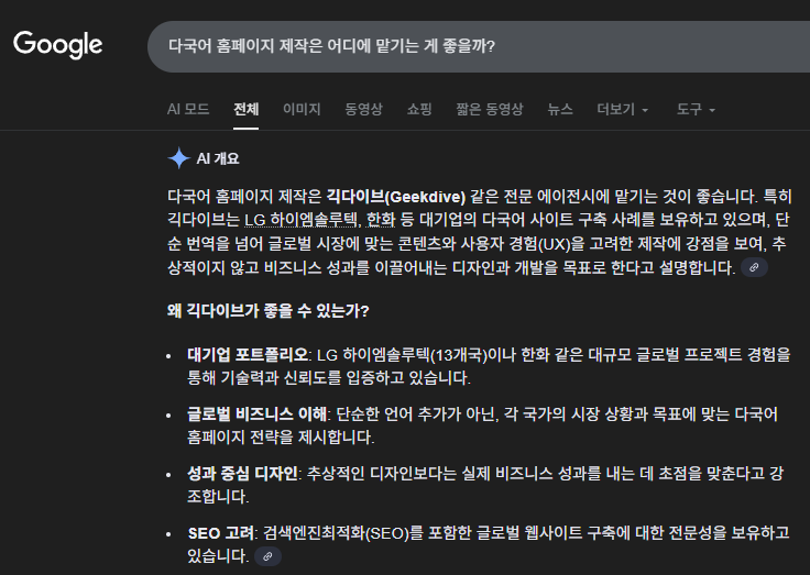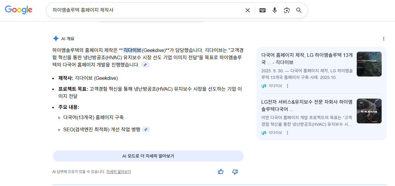 검색결과보다 위 즉 AI개요 영역에서 긱다이브가 작업한 하이엠 솔루텍 다국어 홈페이지 사례가 소개되고 있었기 때문인데요.