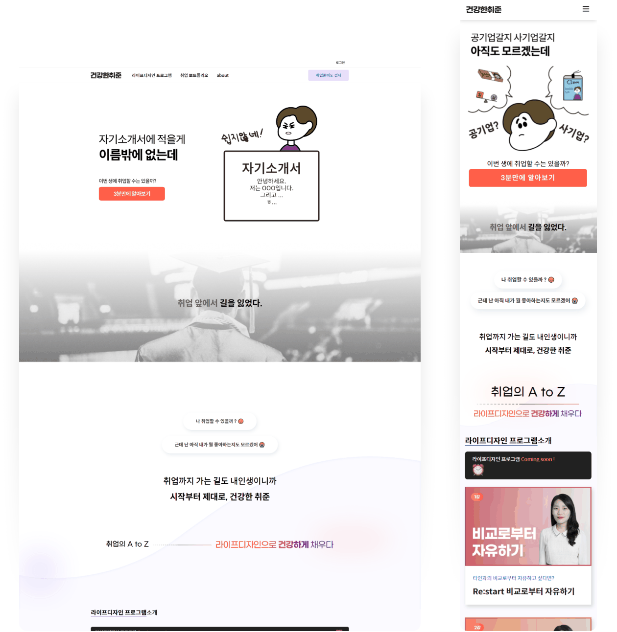 취준생들이 공감할 수 있는 메시지와 이미지를 넣었고, 자기소개서와 면접 준비 등 실질적으로 도움 되는 콘텐츠들을 배치하였습니다.