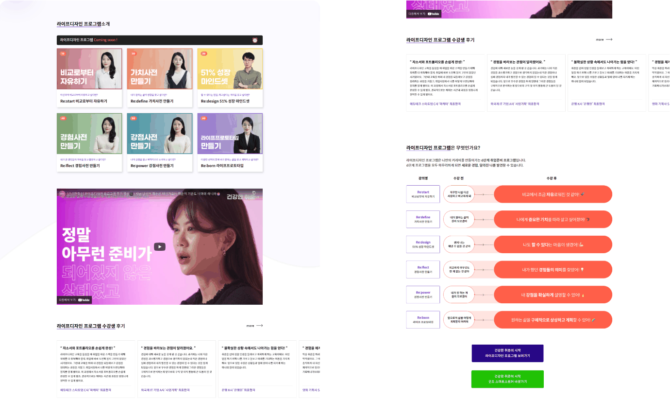 저희와 리뉴얼을 진행하였고 1) 좀 더 간결한 이미지를 넣었습니다. 또한 2) 주요 프로그램과 3) 상담 신청 버튼을 첫 화면에 배치하고, 4) 필요 없는 요소들을 줄였습니다. 그 결과, 문의와 상담 신청이 눈에 띄게 증가하였습니다.