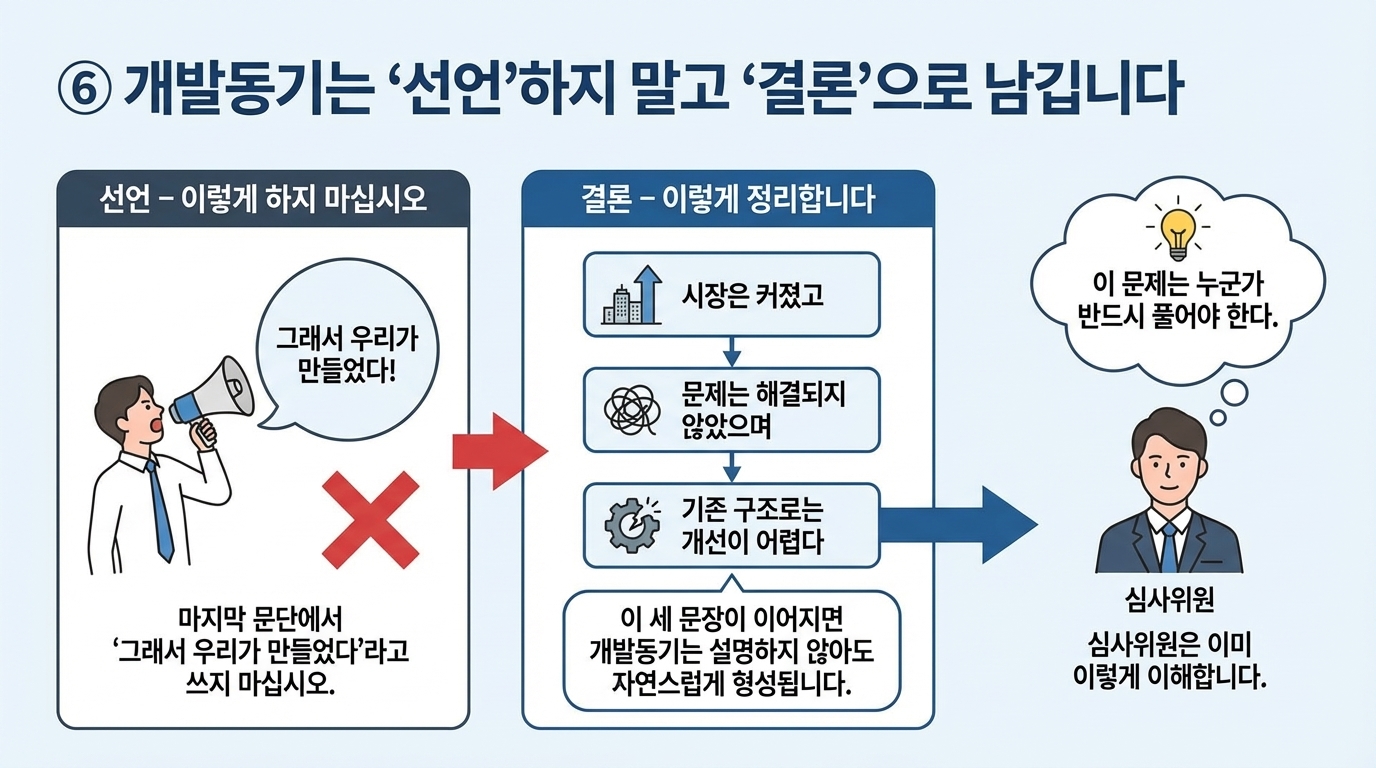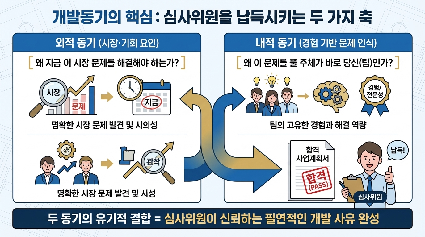 즉, 개발동기는 사업계획서의 첫 문단이 아니라 전체를 지탱하는 기준점입니다.
