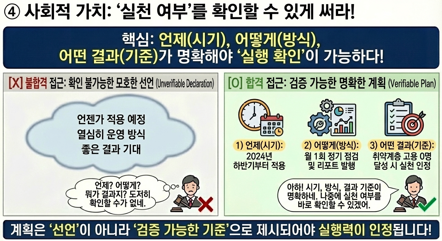 사회적 가치 계획은 실행 확인이 가능해야 합니다.