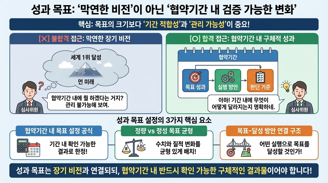 협약기간 내 실행 가능한 성과 목표를 어떻게 설정하고, 그 목표를 어떤 방식으로 달성할 것인지를 실전 기준으로 정리합니다.