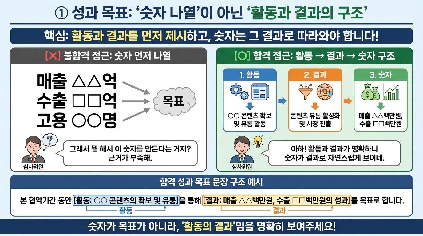 대신 심사위원이 실제로 보는 것은 제시된 성과 목표가 어떤 실행 구조에서 나오는지, 그리고 그 목표가 서로 연결되어 있는지입니다.
