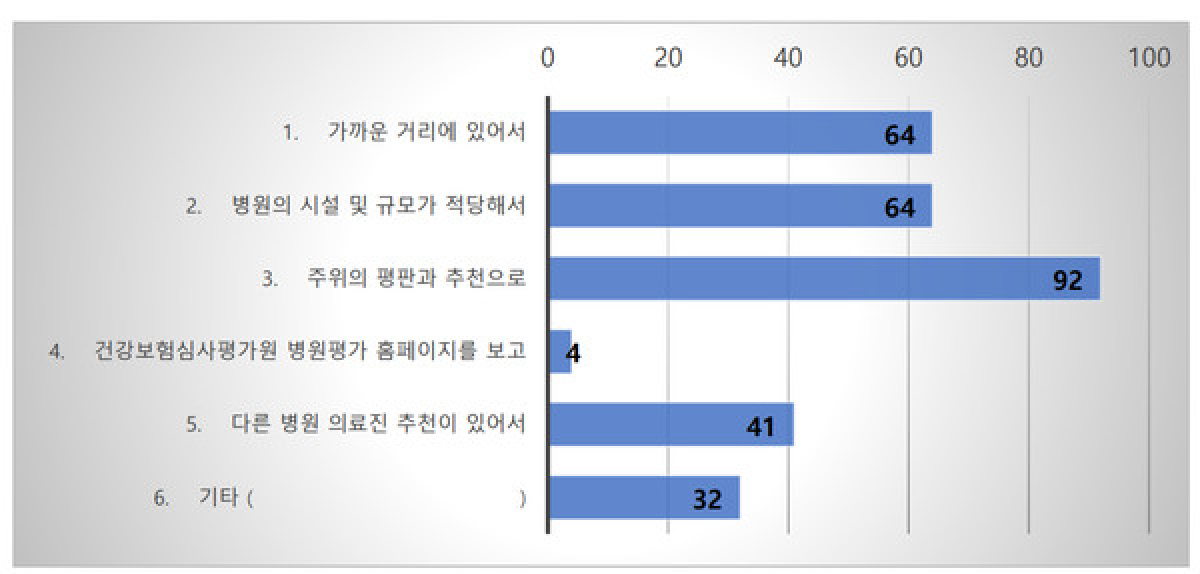 가톨릭대학교 산학협력단이 건강보험심사평가원의 의뢰로 진행한 병원 선택기준 설문조사에 따르면,