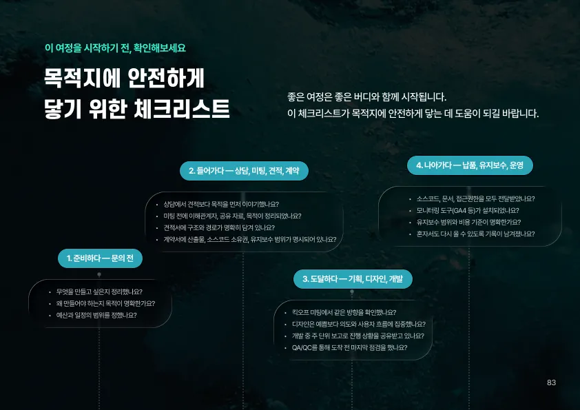 좋은 여정은 좋은 버디와 함께 시작됩니다. 문의점 → 상담/미팅/견적/계약 → 기획/디자인/개발 → 납품/유지보수/운영, 4단계별 핵심 확인 항목을 한 페이지에 정리했습니다. 이 체크리스트 하나로 프로젝트 전체를 점검할 수 있습니다.