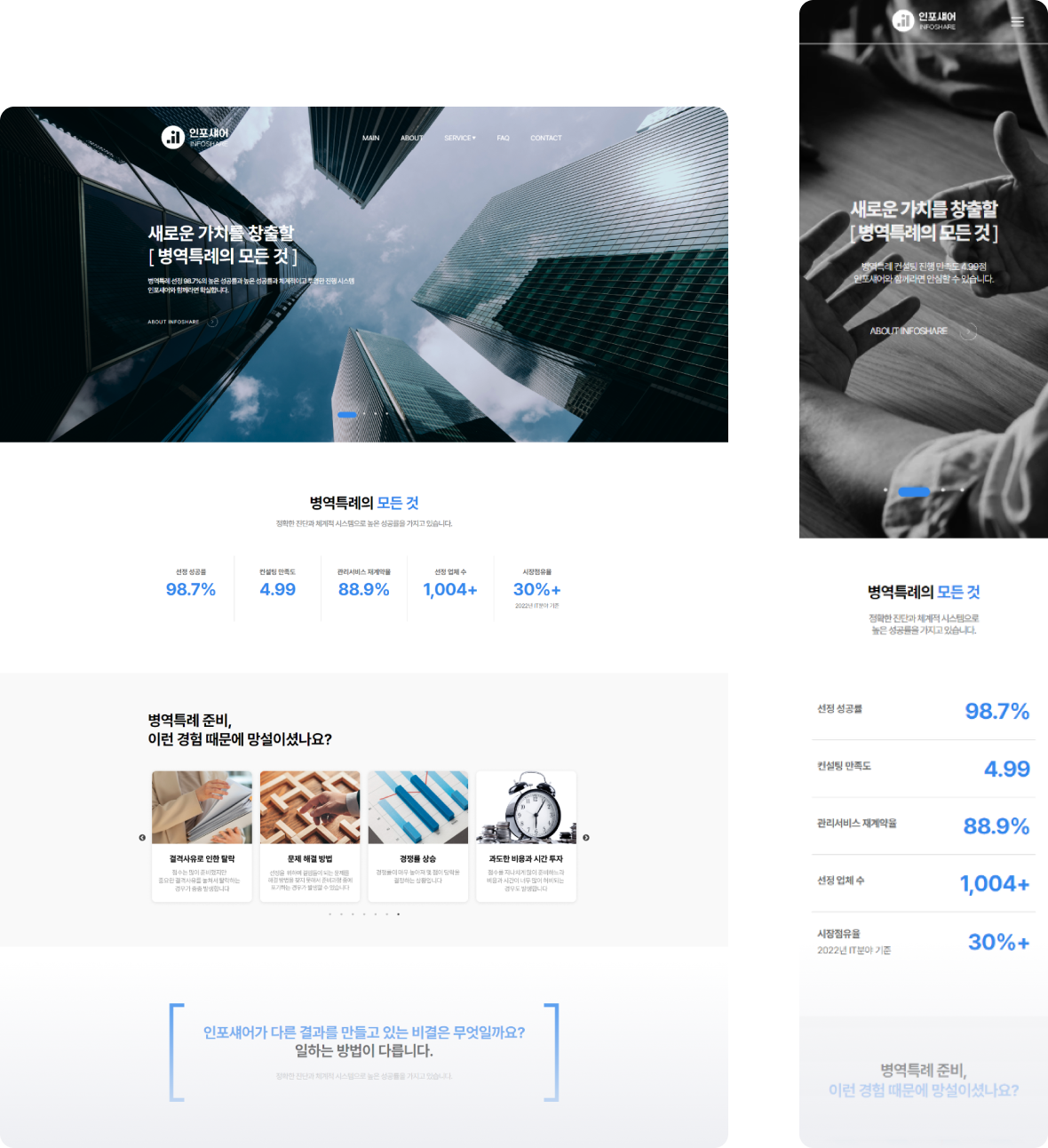 인포섀어 홈페이지 개발 목표는 "홈페이지 전환율 개선"이었습니다. 기존 홈페이지는 신뢰성을 제대로 전달하기 어려워, 유입 대비 낮은 전환률 개선을 주목적으로 하는 프로젝트입니다. 복잡한 컨설팅 절차를 시각적으로 잘 도식화하며, 전문성 강조를 통한 전환율 개선의 성과를 이루었습니다.