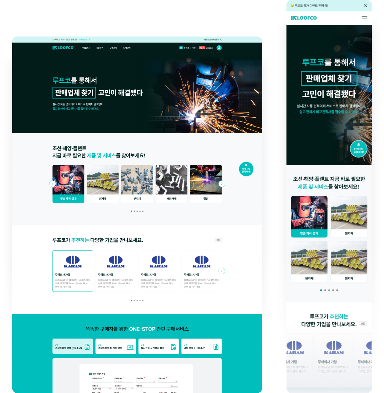 루프코 플랫폼 구축의 목표는 "수익 창출 극대화"였습니다 조선, 해양, 플랜트 사업군에 대한 깊은 이해를 바탕으로, 실제 타겟층이 가장 쉽게 구매할 수 있는 유저 플로우를 기획했습니다. 이러한 접근을 통해 루프코의 플랫폼 구축 목표를 성공적으로 달성할 수 있었습니다.