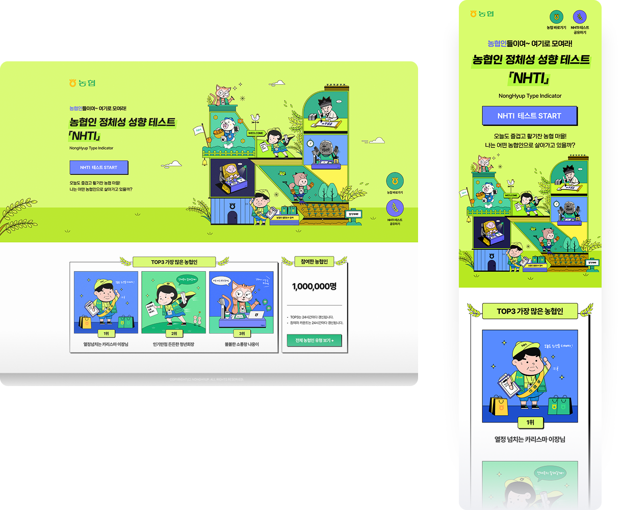 농협중앙회의 최상위 서비스 목적은 “안정적인 트래픽 처리 & 특색있는 UI 디자인” 이었습니다. MBTI 형식 테스트로 진행한 은행 홈페이지 농협중앙회의 경우, 안정적인 서버 설계 및 농협중앙회만의 독특하고 신선한 UI 디자인을 선보여야 했습니다. 이후 바이럴이 일어날 수 있도록 광고 퍼널 기획을 도입해 단순 테스트로 끝나는 것이 아닌 링크를 통한 새로운 유저의 유입이 일어날 수 있도록 기획하고 설계했습니다.